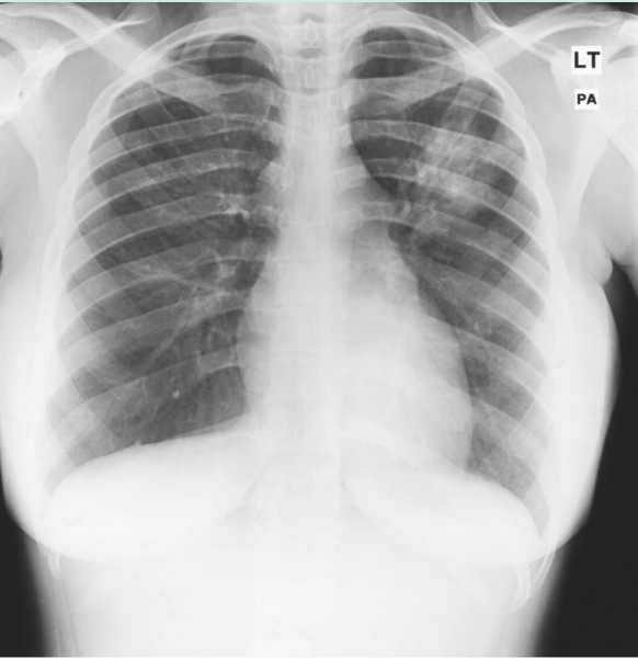 Fig 23.6 胸片显示了肺结核的典型改变,这些改变往往会影响到肺尖。左肺上部的混浊清晰可见。