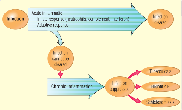 大多数炎症都是对感染的反应。急性感染是指持续几天的并在大多数情况下会被免疫系统清除的感染,很少会导致死亡。急性感染的例子包括流感和葡萄球菌脓肿。先天免疫系统对这些感染的清除发挥了很大的作用,尽管在这些例子中,这一系统分别得到了辅助性T细胞1(TH1)和TH17细胞的帮助。如果刺激不能迅速消除,炎症往往会变成慢性的。Fig 23.1TABLE 23.1显示了一些导致慢性或急性炎症的感染。