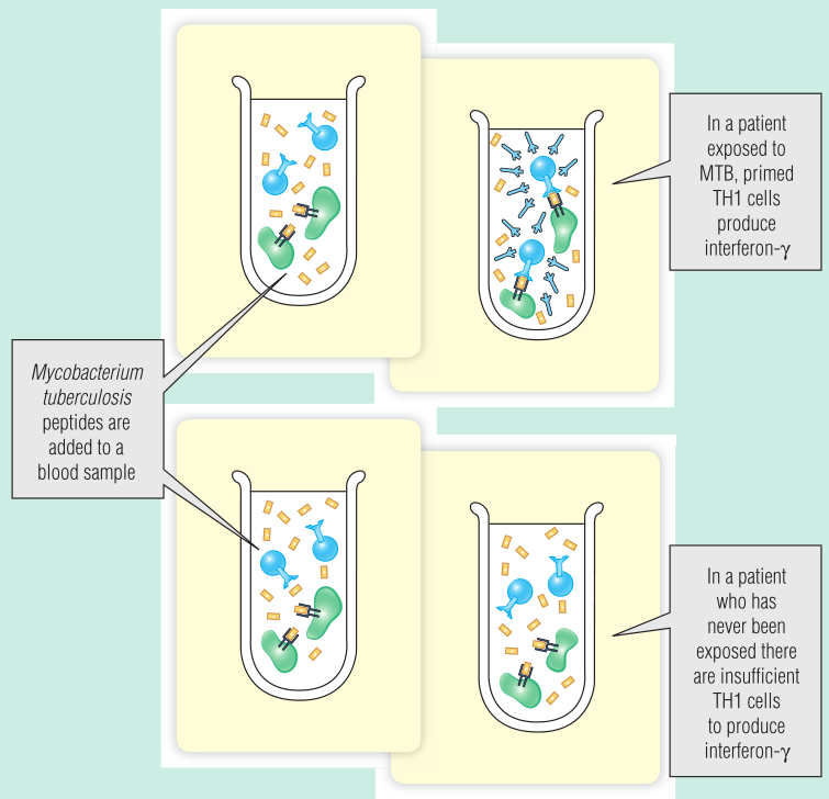 这两种检测方法安全地用于检测潜伏性结核病,都能评估对结核病的细胞免疫力,意味着要么暴露于结核病本身,要么意味着患者已经接种了疫苗。这些检测最常用于筛查接触过开放性结核病患者。较老的测试是一种皮肤测试,依赖于迟发型过敏反应。皮肤测试正逐渐被血液测试所取代,该测试测量分枝杆菌抗原产生的干扰素γ(IFN-γ)的分泌(Fig 23.7)。
