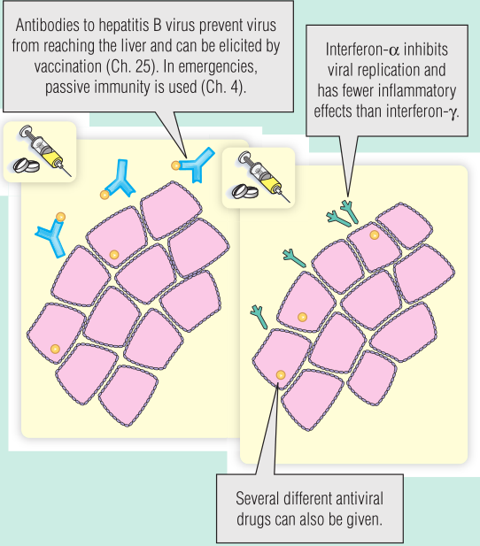 Fig 23.10显示了可用于预防或治疗HBV感染的治疗方法。医生决定开始使用干扰素-α治疗抑制病毒复制,但不增加免疫激活或炎症。IFN-α是一种I型干扰素,其抗病毒作用比免疫刺激作用更强(第20章)。干扰素γ(IFN-γ)促炎作用比抗病毒作用更强,在这种情况下发挥负面影响。