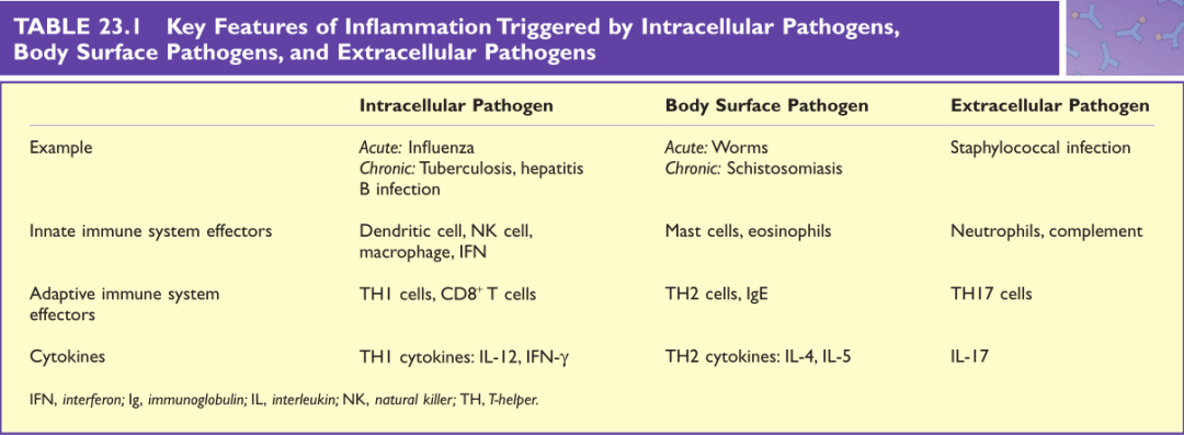 Table 23.1 由细胞内病原体、体表病原体和细胞外病原体引发的炎症的关键特征