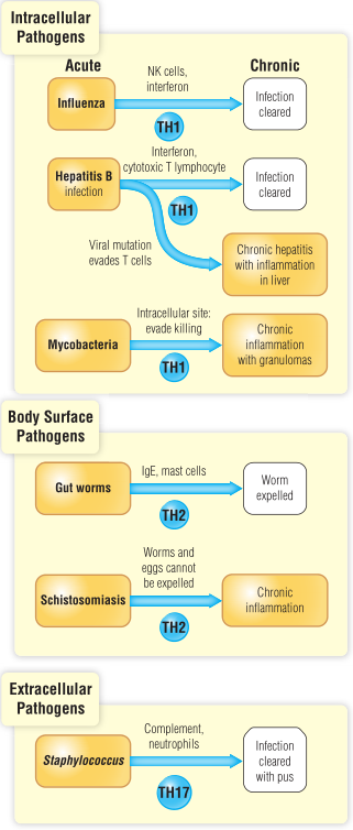 由肥大细胞介导的急性炎症以水肿为特征;当炎症持续时间较长时,嗜酸性粒细胞进入炎症组织。第22章讨论的血吸虫病是肥大细胞和嗜酸性粒细胞介导慢性炎症的一个很好的例子。这是生活在体表上的生物体的例子;这类慢性炎症是TH2细胞调节的。尽管TH17细胞在清除细胞外病原体引起的急性感染方面发挥了重要作用,但目前还没有证据表明它与人类慢性感染有关。