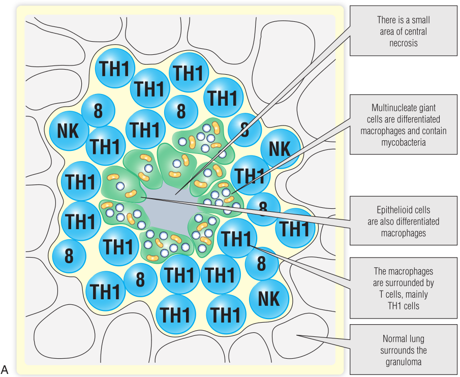 结核分枝杆菌通过结合识别分枝杆菌脂蛋白和多糖的Toll样受体(TLRs)2和4来刺激巨噬细胞。这会刺激巨噬细胞吞噬和分泌炎症介质,如IL-12和一氧化氮。巨噬细胞呈递的分枝杆菌多肽可以引起强烈的TH1反应。其中最重要的是分泌TNF和IFN-γ,在初次感染时刺激肉芽肿的形成。