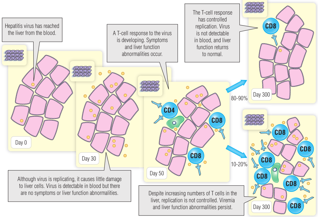 Box 6.1中,1名女性被诊断感染乙型肝炎病毒(HBV)。虽然她最初感到不适,但她之后感觉好了起来。病毒DNA和乙型肝炎表面抗原(HBsAg)水平下降(见Fig 6.8c)。这表明她已经进入了乙肝感染的免疫控制阶段,没有损害到她的肝脏。