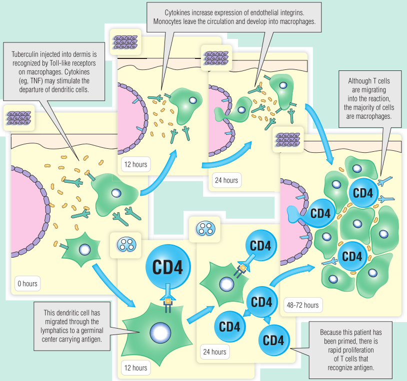 IFN-γ释放试验依赖于血液中循环的效应性T细胞的存在,在潜伏结核患者加入抗原后24 h内,效应性T细胞能够分泌IFN-γ。迟发型过敏皮肤测试是通过皮内注射结核菌素进行的,结核菌素是一种来自结核分枝杆菌的蛋白质和脂蛋白的无菌混合物,取决于使用的注射技术的类型。当真皮巨噬细胞上的Toll样受体(TLRs)识别分枝杆菌并相应地分泌肿瘤坏死因子(TNF)和趋化因子时,该反应就开始了,这两种因子增加了局部内皮粘附分子的表达(Fig 23.8)。