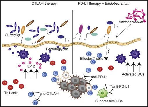 肠道共生细菌对健康和疾病中免疫反应的形成(和重塑)的影响一直是当前免疫学研究的核心。最近研究表明,在转移性黑色素瘤患者中,抗CTLA-4治疗诱导T细胞对部分“免疫原性”肠道细菌(如Thetaiotaomicron和B.Fragilis)产生免疫应答,此过程与临床疗效相关。在对肿瘤高度敏感的小鼠模型中,引入双歧杆菌,显著改善了对肿瘤负荷的细胞毒性淋巴细胞依赖性的控制。双歧杆菌接种结合抗PD-L1单克隆抗体注射,进一步加强了这些动物的肿瘤控制,从而强化了肠道微生物区系在决定抗癌免疫反应中的关键作用。因此,用免疫阻断疗法或T细胞免疫疗法补充肠道细菌中的生物活性物质可能会潜在地改善晚期癌症患者的新抗原特异性免疫反应。