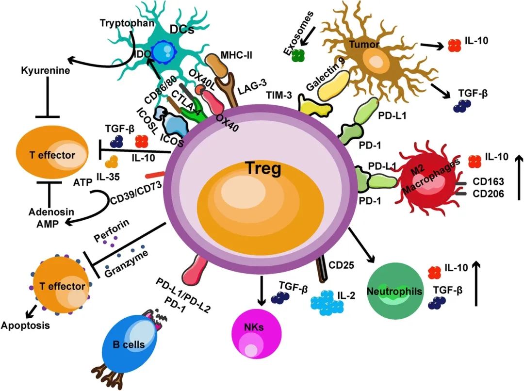 T细胞的免疫耐受性对于预防明显的病理状态是必要的,而Treg数量的增加对基于细胞的免疫疗法的成功具有重要意义。虽然输注间充质基质细胞来下调严重炎症后会产生转化生长因子-β并激活Treg,但回输到肿瘤患者体内的T细胞产品只允许含有最低限度的Treg亚群,以优化癌症特异性T细胞介导的抗肿瘤活性。此外,肿瘤微环境中慢性炎症时产生的IL-17可以诱导转化生长因子-β的产生,抑制CD8+T细胞的反应。TAA也可以刺激Tregs,即给予NY-ESO-1/ISCOMATRIXTM治疗性疫苗的黑色素瘤患者的NY-ESO-1157-170特异性Treg反应;NY-ESO-1119-143和TRIG-334-48(来源于另一种癌症睾丸抗原,癌症/睾丸抗原家族24)可以诱导黑色素瘤患者Th1细胞和FoxP3+ Tregs的增殖,从而促进免疫应答。需要更多的研究来更好地理解某些突变是否代表针对癌症突变的Tregs的名义上的表位。