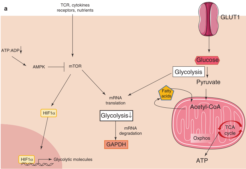 在代谢活动方面,初始T细胞处于静止状态。在抗原识别后,CD4+和CD8+ 初始T细胞变得高度增殖和分化。在TCR刺激下,糖酵解相关基因的表达上调,包括细胞外营养物质转运体的表达,导致代谢重编程,在此过程中细胞大量增加营养物质的摄取,尤其是葡萄糖。这种代谢重编程是在雷帕霉素靶点mTOR的控制下进行的。mTOR是一种蛋白激酶,作为各种环境信号的中心整合者,能够相应地调节多种细胞过程 (Fig 5.2a)。其中包括自噬、葡萄糖摄取和消耗(糖酵解)、蛋白质和脂质合成的控制,这些都是T细胞激活的关键过程。活化的T细胞参与有氧糖酵解过程。有趣的是,在T细胞中,糖酵解对GAPDH的调节非常重要,GAPDH通过连接T细胞效应功能和葡萄糖的可用性,起到代谢检查点的作用。事实上,在缺乏底物的情况下,GAPDH会干扰IFN-γ在TH1细胞中的翻译。重要的是,糖酵解过程中涉及的大多数酶,如GAPDH,都可以进入细胞核,并发挥其他功能,直接影响细胞增殖相关因子的转录和稳定性。脂肪酸的合成也通过提供脂质供应对T细胞增殖和分化发挥重要作用。脂肪酸合成也参与和T细胞激活有关的蛋白质的翻译后修饰。例如,肉豆蔻酰化是影响蛋白质-脂质相互作用和影响蛋白质细胞定位的过程,是TCR信号进行下游事件的必要条件。因此,TFs的脂依赖的修饰有可能会影响它们的细胞定位,如核易位,在那里它们可以启动特定的转录程序。尽管T效应细胞具有高度的糖酵解性,但Sena等人证明,它们的激活和增殖完全可以通过功能性线粒体代谢来维持。线粒体也支持T细胞的激活,其可以通过调节其胞质钙(Ca2+)来支持TCR相关事件。也有研究表明,线粒体的生物发生在T细胞激活时上调。因此,线粒体重塑和线粒体代谢的增加可以支持T细胞激活后细胞的生长和增殖。