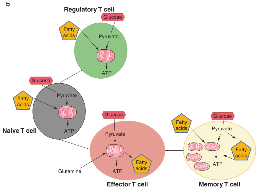 Fig 5.2 代谢状态和T细胞分化。(b)不同的T细胞亚群及其主要代谢特征:Treg和初始T细胞具有相似的代谢特征,大多数葡萄糖和脂肪酸在线粒体中被完全氧化以生成ATP。