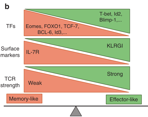 在CD8+ T细胞分化的转录调控中,一个重要的概念模型是,一对对转录因子以相反的方式作用,调控效应与记忆性CD8+ T细胞(Fig 5.1b)。例如,在活化的CD8+ T细胞中,T-bet的表达最初由TCR信号诱导,然后由IL-12信号增强。在病毒特异性CD8+ T细胞中,与KLRG1loIL-7Rhi记忆前体效应CD8+ T细胞相比,KLRG1hiIL- 7rlo短寿命效应CD8+ T细胞中T-bet表达升高。这一发现提示T-bet的表达像变阻器一样控制效应型CD8+ T细胞分化和记忆型CD8+ T细胞电位之间的平衡。较高数量的T-bet指示KLRG1hiIL-7Rlo效应细胞的形成,但较低数量的T-bet似乎意味着正常的记忆细胞形成。eomesdermin (Eomes)是另一种在活化的CD8+ T细胞中表达的T-box因子,它对CD8+ T细胞中CD122和穿孔素的表达也很重要。一方面,T-bet和Eome似乎在CTL功能和记忆T细胞稳态中合作。T-bet和Eomes协调CD122在记忆性CD8+ T细胞中的表达,CD8+ T细胞在淋巴细胞性脉络丛脑膜炎病毒(LCMV)感染期间,这两种基因均双缺陷,不能产生CTL。相反,Tbx21−/−Eomes−/−CD8+ T细胞会异常分化为产生IL-17的CD8+ T细胞,导致中性粒细胞过度浸润和致人死亡的炎症综合征。另一方面,与T-bet相反,IL-12抑制Eome的表达并随着记忆性CD8+ T细胞的形成和成熟,Eome的表达增加。这种平衡也适用于转录因子对Id2和Id3,以及Blimp-1和BCL-6和其他转录因子对(Fig 5.1b)。虽然上述模式主要表现在CD8+ T细胞中,但同样的系统似乎也控制着CD4+ T细胞的记忆。据报道,Blimp-1和BCL-6对CD4+ T细胞的记忆亚群有影响。
