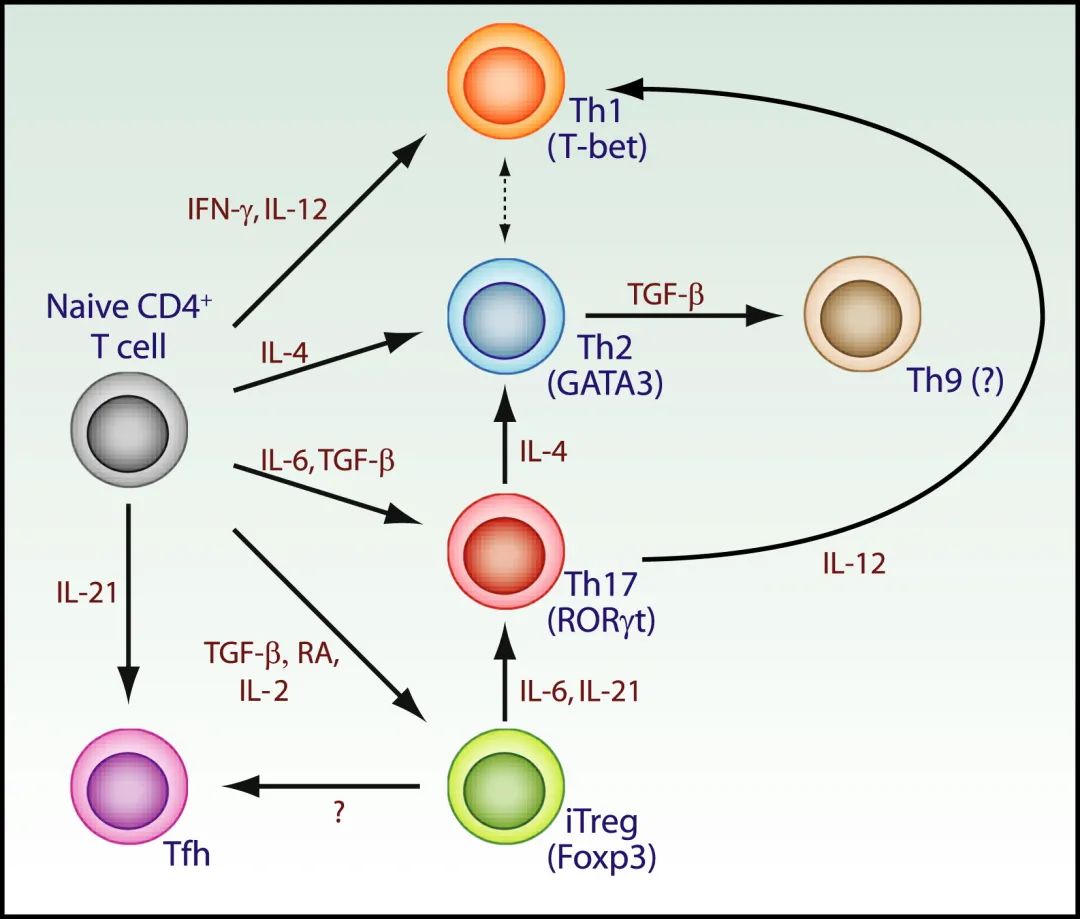 幼稚的CD4 T细胞分化成几个亚群,这些亚群表达不同的转录因子,分泌不同的细胞因子,并发挥各种免疫功能。这导致了不同CD4 T细胞之间功能异质性的概念。Th1细胞分泌IFN-γ并限制由细胞内细菌引起的感染,而Th2细胞分泌IL-4、IL-5、IL-10和IL-13,使免疫反应偏向体液免疫。自Th1/Th2二分法出现后,又发现了一些效应和调节性CD4 T细胞的新亚群,例如分泌IL-17并促进炎症的Th17细胞,表达Foxp3转录因子并抑制免疫反应的Foxp3调节性T细胞(Treg),分泌IL-10的Tr1细胞也可调节免疫反应,并依赖转录因子c-Maf和AhR进行发育。Th9细胞在TGF-β和IL-4存在的情况下可从初始CD4 T细胞分化而来,随后被鉴定为表达PU.1转录因子并分泌细胞因子IL-9的CD4 T细胞。虽然Th9细胞最初被证明在结肠炎、哮喘和实验性自身免疫性脑脊髓炎(EAE)中发挥促炎作用,但在最近已经证明在多发性硬化的小鼠模型中,这些细胞在体内过继转移后表现出强大的抗癌特性。总的来说,T细胞分化为不同类型效应细胞的能力将决定适应性免疫反应的质量和程度,并与大量疾病明确相关。在这里,我们将回顾T细胞分化,重点是决定T细胞命运的分子机制。这部分不讨论直接利用T细胞特性治疗癌症的一些应用而是重点关注T细胞分化的分子机制,第2、3、4和5部分将充分讨论T细胞调控与肿瘤治疗的相关性。不过在本章中,我们将会介绍一些由于T细胞分化缺陷所导致的人类疾病。