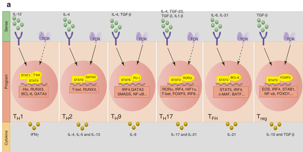 当从CD4+ T细胞分化出辅助性T细胞(TH)和调节性T细胞(Treg)时,代表了相对较晚期的分化阶段。抗原和细胞因子是T细胞通过T细胞受体(TCR)和细胞因子受体感受到的关键细胞外信号。将抗原连接到TCR可激活转录因子(TF),如核因子-κB(NF-κB)、活化T细胞的核因子(NFAT)和激活蛋白1(AP-1),而与同源细胞因子受体结合的细胞因子可激活信号转导子和转录激活因子(STAT)。TCR与MHC分子上其同源抗原的亲和力,还有共刺激受体-配体的相互作用,联合起来将产生不同强度的胞浆信号,从而控制下游TFs的活动。TCR信号的强度变化通过调节CD4+ T细胞亚群对不同细胞因子的反应、诱导特异性细胞因子受体的表达,或影响特异性STAT的激活来影响CD4+T细胞亚群的分化。通常强TCR信号有利于TH1、TH17和TFH细胞分化,而弱TCR信号促进TH2细胞和诱导的Treg细胞(iTreg)的发育(Fig 5.1a)。细胞因子通过I/II型细胞因子受体超家族发出信号,该家族使用Janus激酶(JAK)–STAT信号通路将环境信号转换为启动特定基因表达程序的内在信号。STATs是DNA结合调节蛋白,能够驱动选择性基因表达程序,促进特定TH细胞亚群的分化。通过TCR和细胞因子受体信号对细胞外环境的感知可激活一个协同作用的先导TFs网络,从而调节整体染色质状态和TH特异性主调节因子的表达。值得注意的是,AP-1、干扰素调节因子(IRF)、STATs和NFAT等因子招募了共同激活剂,如染色质重塑剂、组蛋白乙酰转移酶(如p300)和负责组蛋白甲基化的酶(如H3K4me1)。这些染色质修饰因子可增加调节元件的可塑性。最后,先导TFs因子网络的激活构建了CD4+T细胞主调节因子结合并介导谱系特异性基因表达程序所必需的特定表观遗传模式(Fig 5.1a)。