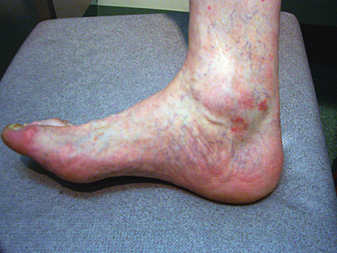 Fig 26.6 病人脚踝上有几块接触性皮炎,植物碎片掉进了他的园艺靴子里。