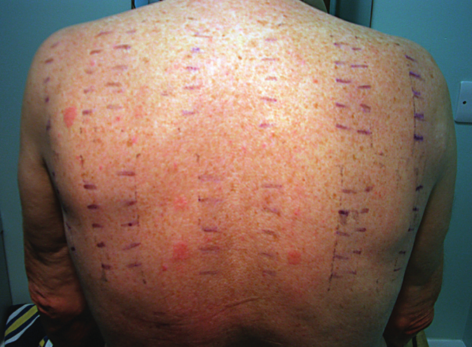 Fig 26.7 在斑贴试验中,可能的致敏抗原放在敷料下面的皮肤上。这个图显示了一个典型的阳性反应,在这种情况下是对三种植物的提取物进行检测。在细胞水平上,这种测试的演变过程与结核菌素皮肤测试非常相似。