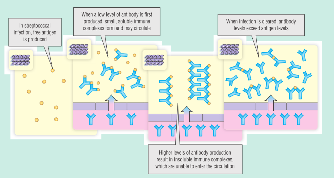 Fig 26.4 链球菌感染后导致肾小球肾炎。急性感染,如链球菌感染,可以触发循环免疫复合物,直到抗原被清除。