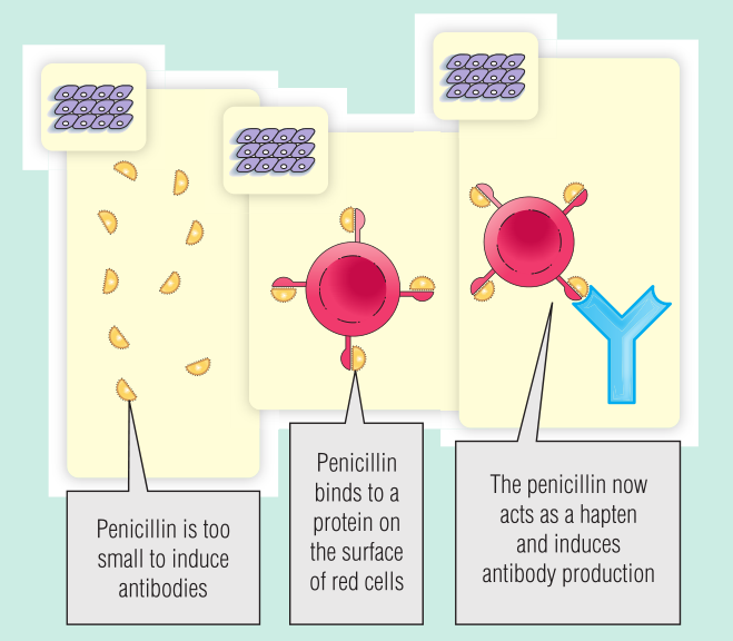 青霉素是一种低分子化合物,本身不能作为抗原,但可以作为半抗原(Fig 26.2;另见Box 5.1)。在青霉素诱导的溶血中,先前接触青霉素会诱发免疫球蛋白G(IgG)抗体。在再次暴露时,青霉素与红细胞结合,成为IgG的靶子。包有IgG的红细胞被吸收并被脾脏破坏(Fig 26.3)。
