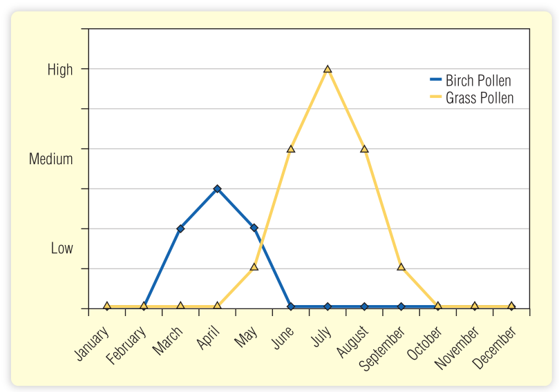 一对在新英格兰长大的兄弟姐妹在一年中的不同时间都会出现流鼻涕和眼睛酸痛的问题。他们两人都注意到自己的症状在室内有所改善,因此不得不出门几分钟后就会回来。女孩的症状在春天更严重,而这个男孩在夏天有症状,这让他在考试中非常辛苦。通过皮肤点刺试验(第27章),结果证实女孩对桦树花粉过敏,男孩对草花粉过敏。图表(Fig 26.1)显示了为什么他们的症状会在一年中的不同时间出现。知道他们住在哪里也很重要,在新英格兰和北欧,青草和桦树花粉很引人注目。在美国的其他地区,豚草问题更严重,而在西班牙和意大利,橄榄花粉经常引起问题。