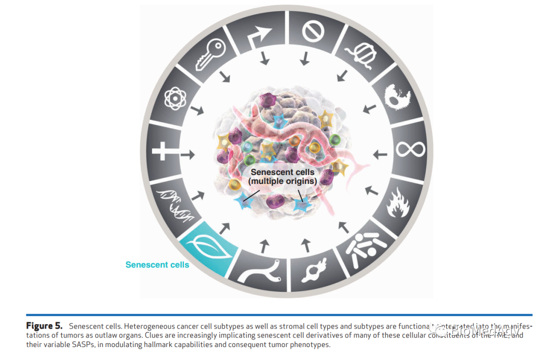 4、衰老细胞(Senescent cells)细胞衰老通常被认为是维持组织稳态的一种不可逆的抑癌性保护机制,然而越来越多的证据表明,在某些情况下衰老细胞可以通过衰老相关分泌表型(Senescence-associated secretory phenotype, SASP)等方式促进肿瘤的发生和发展。不过,衰老作为一个肿瘤标志的研究仍在起步阶段,还需进一步的广泛验证和严谨审视。