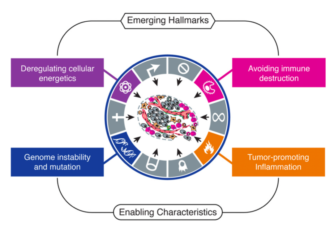 新增加的4大标志性特征考虑了肿瘤代谢、肿瘤免疫以及基因组不稳定性在肿瘤发生发展过程中的重要作用。4个新增标志中,前两个被定义为“初现标志(emerging hallmarks),因为两者的作用还未得到全面的验证;而后两者被定义为“赋能特征(enabling characteristics),因为正是它们导致了肿瘤异常状态的后果(consequences)。此外,作者还明确了一个观点,即肿瘤的发展不仅是肿瘤细胞数量的增加,也需要围绕“肿瘤微环境”进行理解。