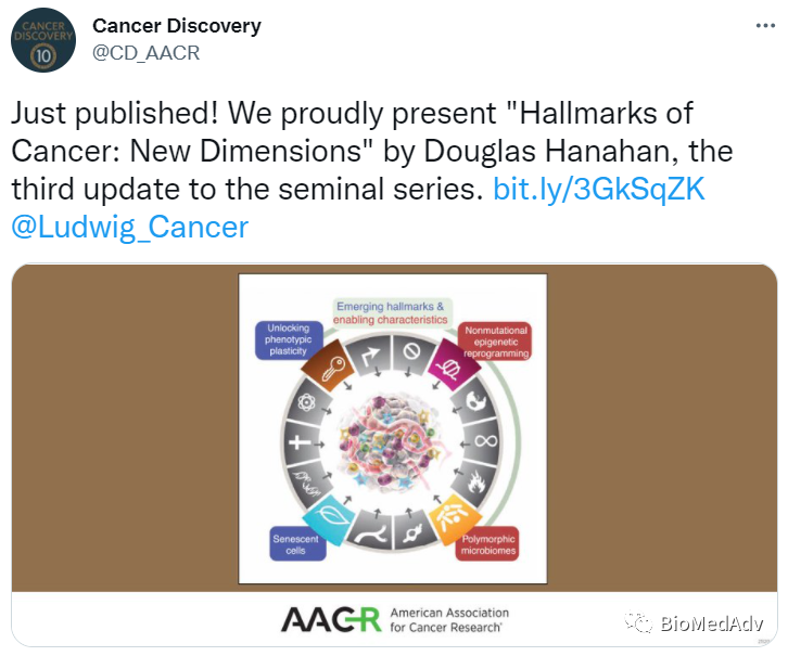 3、Douglas Hanahan. Hallmarks of Cancer: New Dimensions. Cancer Discov. 2022; 12: 31-46.