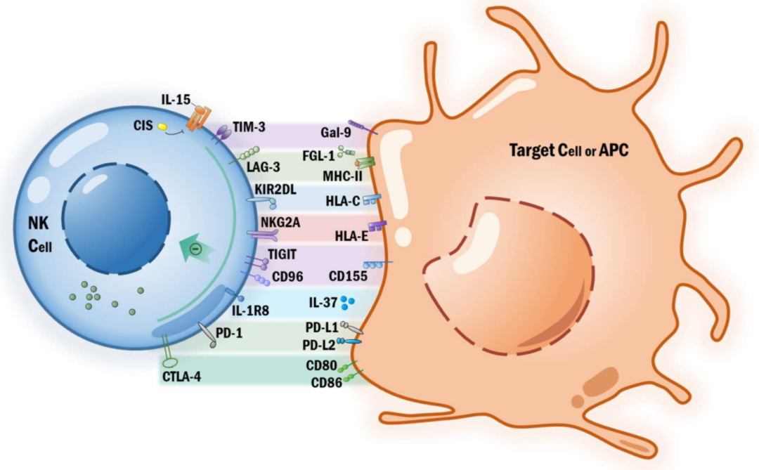 TIGIT和CD96与Nextin和Nectin样分子家族相互作用的受体能有效抑制NK细胞和T细胞功能,它们可以与CD155结合并抵消DNAM-1介导的NK细胞活化。TIGIT可抑制小鼠和人NK细胞介导的细胞毒性作用,CD96可减少小鼠NK细胞产生干扰素-γ。CD96基因缺陷的小鼠对实验性肺转移和癌变表现出很强的抵抗力,而TIGIT在NK细胞介导的癌症监测中的作用仍有待研究证明。
