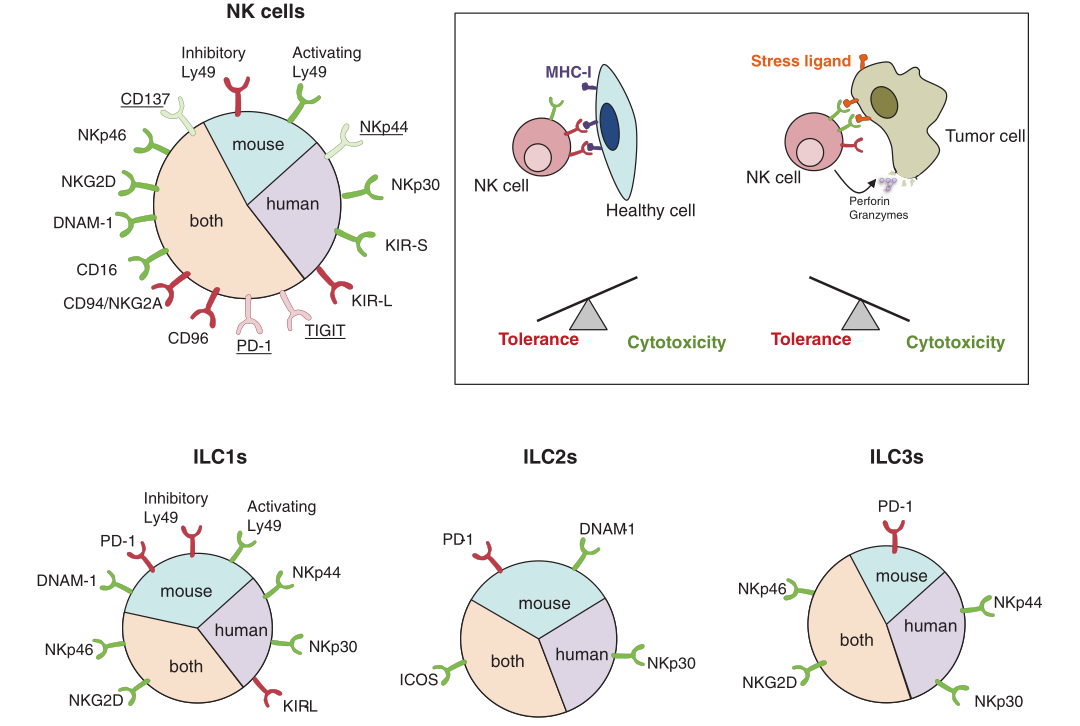 NK细胞是第一个被发现的ILC亚群,最初被鉴定为具有自发的细胞毒活性。NK细胞通常被称为CD3阴性细胞,在人类中表达CD56,在小鼠中表达NK1.1,在两种物种中都表达NKp46。这种对NK细胞的表型定义同样适用于一些其他的ILC亚群。