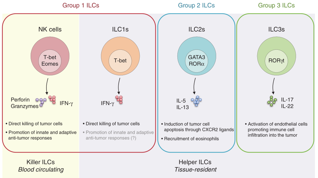 NK细胞中许多表面受体能够区分癌变的细胞和正常细胞。此外,NK细胞不仅具有强大的细胞毒性功能,而且还是抗肿瘤细胞因子干扰素-γ的主要来源。这些特性使NK细胞在机体对癌症的先天免疫检测中起着至关重要的作用。然而,与大量关于癌症中 NK 细胞的报道完全相反,辅助型 ILC 可能的促肿瘤或抗肿瘤功能在很大程度上仍未得到探索。最近仍有研究表明组织中的1类ILC参与了自发性肿瘤的免疫监测。此外,其他各种报道也阐述了ILC2s和ILC3s的抑瘤活性。