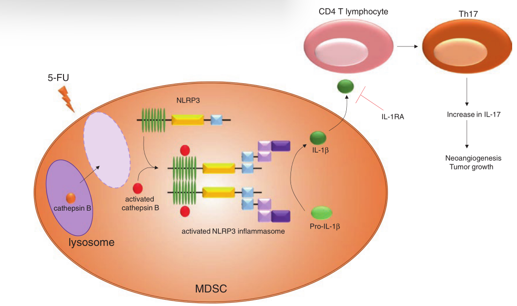 Fig. 11.1 :5-FU依赖的MDSCs耗竭。5-FU特异性靶向和消耗MDSCs,降低整体免疫抑制。然而,5-FU也能诱导MDSCs溶酶体的通透性增加。然后,组织蛋白酶B可以从溶酶体进入细胞质,与NLRP3相互作用,诱导NLRP3炎症小体的形成和激活。激活的NLRP3炎症体将前IL-1β裂解为活性IL-1β,激活CD4T细胞产生更多IL-17,促进新血管生成和肿瘤生长。