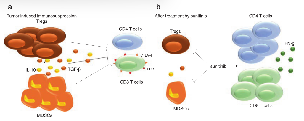 在肾癌中,舒尼替尼通过影响MDSC的存活率和增殖来逆转MDSC的积聚。MDSC的减少与CD3细胞产生IFN-γ的增加有关。舒尼替尼可减少MDSCs和Tregs的数量,减少免疫抑制细胞因子IL-10、TGF-β的产生。