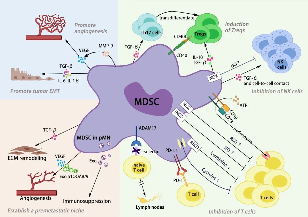 MDSCs可帮助建立有利于肿瘤生长的微环境,这要归功于它们能够产生促血管生成的介质,如VEGF、bFGF、MMP9或PDGF等分子,这些分子对新血管的形成很关键,而新血管对维持肿瘤生长至关重要。