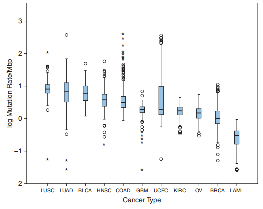 Fig.13.4 不同原发肿瘤类型的突变负荷;(LUSC肺鳞状细胞癌、LUAD肺腺癌、BLCA膀胱尿路上皮癌、hNSC头颈部鳞状细胞癌、COAD结肠腺癌、GBM胶质母细胞瘤、UCEC子宫体子宫内膜癌、KIRC肾透明细胞癌、卵巢浆液性囊腺癌、BRCA乳腺浸润性癌、LAML急性髓系白血病)
