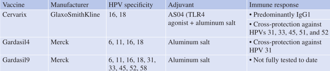 目前预防HPV疾病的策略包括筛查、使用细胞学或HPV检测,又或是两者结合。预防感染致癌HPV基因型的疫苗由L1的非感染性重组病毒样颗粒(VLP)组成,L1是两种HPV衣壳蛋白之一。这些VLP不含病毒DNA,因此完全不具感染性和致癌性。目前,有三种构建物可供选择:Cervarix©,靶向HPV 16和18型(bHPV)并辅以ASO4佐剂;Gardasil4©,靶向HPV 6、11、16和18型(qHPV);Gardasil9©,靶向HPV 6、11、16、18、31、33、45、52和58型(nHPV)(Table. 15.1)。所有配方都对HPV感染非常有效,不仅仅在宫颈,而且在其他解剖部位都非常有效,且无论男女。这些疫苗产生的强健抗体反应比自然感染引起的抗体反应大1-2个对数。在已知以前接触过HPV的人中,单次接种qHPV大大提高了抗体反应的强度和质量。与自然感染产生的非中和抗体不同,接种疫苗产生的抗体是中和抗体。虽然bHPV和qHPV疫苗都显示出对其他HPV类型的交叉保护,但Cervarix©对HPV 31、33、45、51和52提供交叉保护,而Gardasil4©被证明只对HPV 31具有交叉保护作用。Cervarix©的广泛交叉反应很可能归因于其佐剂ASO4,这是一种TLR4激动剂。现有的预防性疫苗Gardasil©和Cervarix©没有治疗效果。然而,来自四价HPV疫苗研究的新证据表明,CIN2/CIN3切除治疗后接种预防性疫苗可显著降低疾病复发的可能性。这种保护作用的作用方式尚不清楚,目前正在积极调查中。