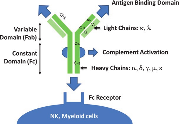 Fc结构域介导的癌细胞死亡的作用已经在回顾性临床研究中得到证实。这些研究表明,在接受抗γ单抗治疗的B细胞淋巴瘤患者和接受抗GD2单抗治疗的儿童神经母细胞瘤患者中,FcγR基因多态性对预后有一定的价值。因此,大多数肿瘤靶向抗体都是设计为IgG1型抗体,其与Fcγ受体CD16A(FcγRIIIa)具有良好亲和力,并能够激活NK细胞以执行ADCC。虽然使用IgG1的理论基础主要建立在血液的NK细胞上,但最近的数据表明,IgG2也可以通过表达髓系细胞的FcγR来执行ADCC。