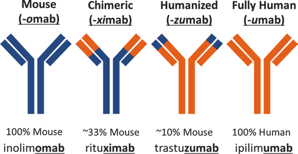 因此,人们想出了许多策略来降低啮齿动物单抗的免疫原性,这些单抗可以产生嵌合的鼠/人单抗或人源化的单抗,最终甚至可以产生全人源单抗。单抗的人源化程度在其名称中有详细说明(Fig 18.2)。