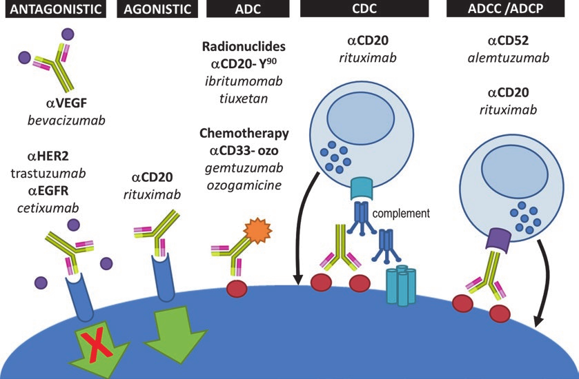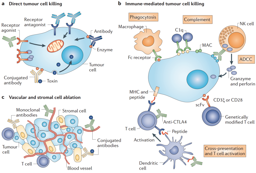 此外,当单抗通过调理作用黏附到癌细胞表面时,其远端部分(Fc结构域)可在宿主免疫效应机制作用下对靶细胞进行破坏。