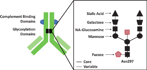 Fig 18.5 单抗的糖基化状态。将N-乙酰氨基葡萄糖一分为二(红色)可增强Fc受体单抗的亲和力,并增强其触发抗体衍生细胞ADCC的能力。
