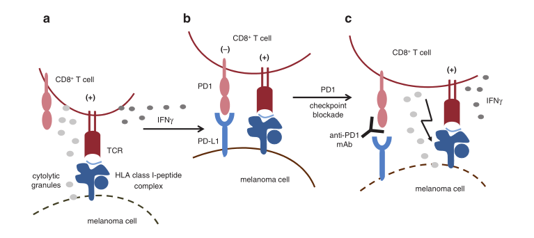 (A)肿瘤浸润性T细胞通过其T细胞受体(TCR)识别黑色素瘤细胞,随后TCR与特定的HLA I类抗原表面复合体结合,活化T细胞。随后被激活的T细胞释放细胞溶解颗粒并分泌干扰素γ; (B)干扰素γ诱导黑色素瘤细胞表达PD-L1,并与抑制性受体PD-1结合,从而抑制T细胞的激活; (C)抗体阻断PD-1与其配体PD-L1之间的相互作用,使T细胞从抑制信号中释放出来,恢复其活性。