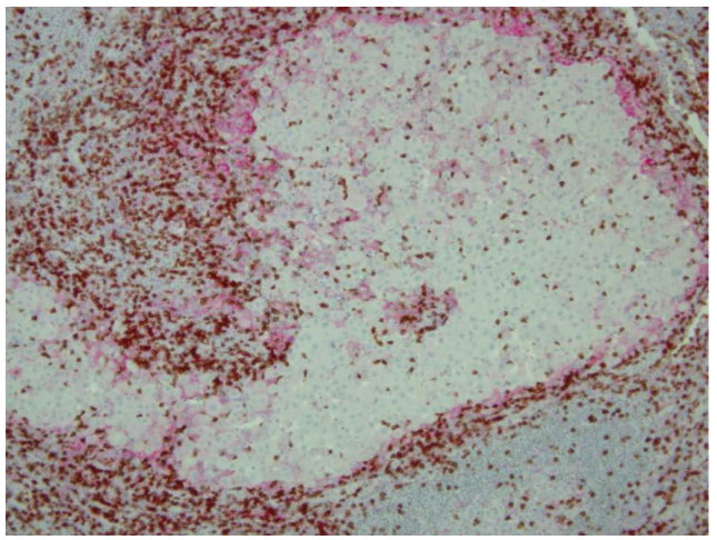 Fig. 19.1 CD8+T细胞旁边的黑色素瘤细胞表达PD-L1。通过免疫组化染色标记黑色素瘤淋巴结病变中的CD8+T细胞(棕色)和黑色素瘤细胞(PD-L1, 红色)。