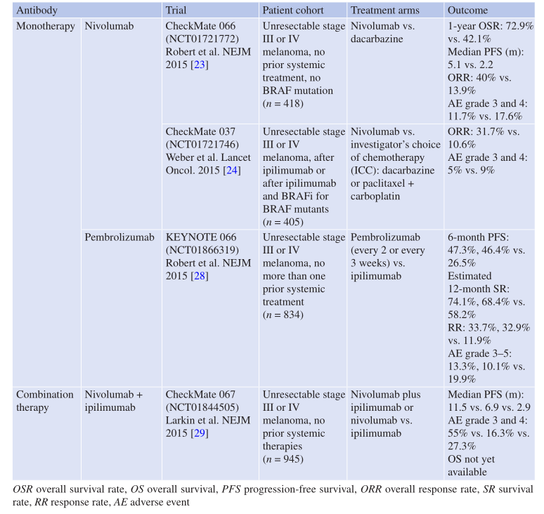 在伊匹单抗之后,两种针对检查点PD-1的抗体被批准用于治疗不可切除和转移性黑色素瘤。FDA和EMA分别批准了纳武单抗和派姆单抗,它们是一种完全人源化的IgG4抗体。基于纳武单抗和派姆单抗的治疗展示出了更高的持久应答率,而与伊匹单抗治疗相比,AE发生的概率要低得多。下面,我们列出了与抗体批准相关的一些临床试验结果(Table. 19.1)。