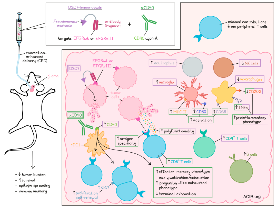 胶质母细胞瘤(GBMs)具有高度的颅内侵袭性,且对免疫治疗有抵抗性。在最近的一项1期临床试验中,研究者在复发性3级和4级恶性胶质瘤患者中评估了D2C7(一种由假单胞菌外毒素和GBM中靶向野生型EGFR (EGFRwt)和突变型EGFR变异体ⅲ(EGFRvIII)蛋白的重组抗体片段构成的免疫毒素)。虽然在一小部分患者中观察到令人鼓舞的生存结果和放射学缓解,但疗效有限。为了探索改善临床应答的途径,Parker等评估了使用激动型抗CD40(ɑCD40)增强抗肿瘤免疫的可能性。