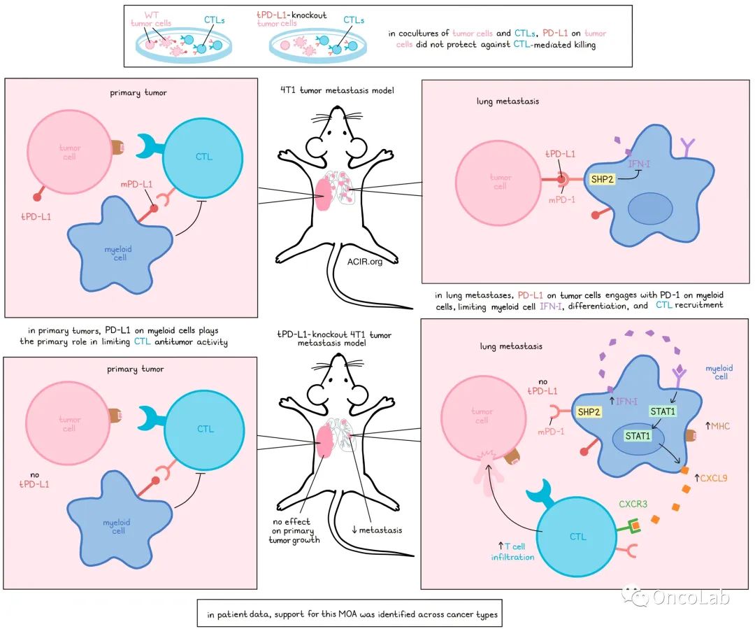 通过一系列敲除和消耗实验,Klement和Redd等人证明,在转移部位,tPD-L1与mPD-1结合,诱导SHP2信号传导,抑制自主性IFN-I信号,引导髓系细胞分化。当打破这个机制时,IFN-I信号会增加,导致STAT1、MHC-I、MHC-II、CXCL9和CXCL10的表达增加。这些变化导致CTLs的增加浸润,这对于限制转移的发展是至关重要的。因此,tPD-L1通过在髓系细胞上的PD-1来限制CTLs,从而支持免疫逃避和转移。
