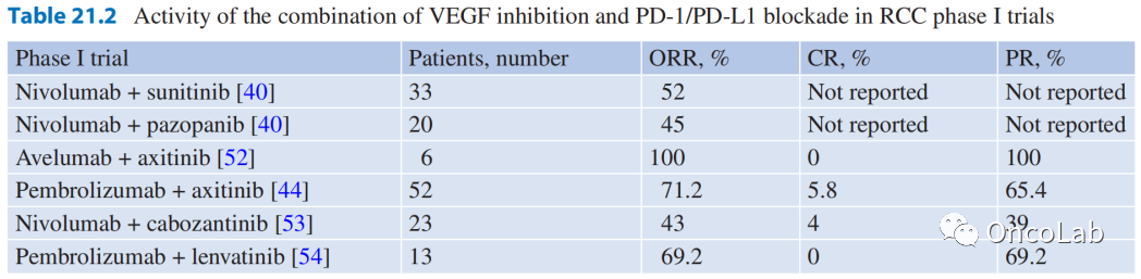 Table 21.2 血管内皮生长因子抑制和PD-1/PD-L1拮抗剂联合应用在肾癌I期试验中的活性