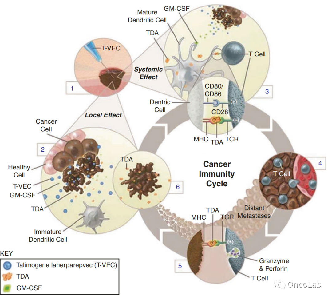 Fig. 24.3 T-VEC 的作用机制。肿瘤内施用 T-VEC(1)后,病毒在癌细胞中选择性复制(2)。T-VEC 还表达 GM-CSF,其促进树突状细胞的成熟和功能,引发系统性 T 细胞介导的抗肿瘤反应(3)。病毒可系统性增殖至远处的肿瘤部位(4)。肿瘤细胞抗原呈递给 T 细胞导致先天免疫系统激活(5)。肿瘤细胞裂解释放肿瘤衍生抗原(TDA)(6)。