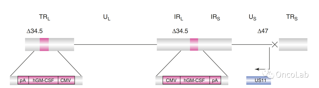 Fig. 24.2 T-VEC 基因组的结构。ICP34.5 和 ICP47 的删除位置标记为Δ34.5和Δ47。用粉红色标记的区域是插入人GM-CSF基因的位点。