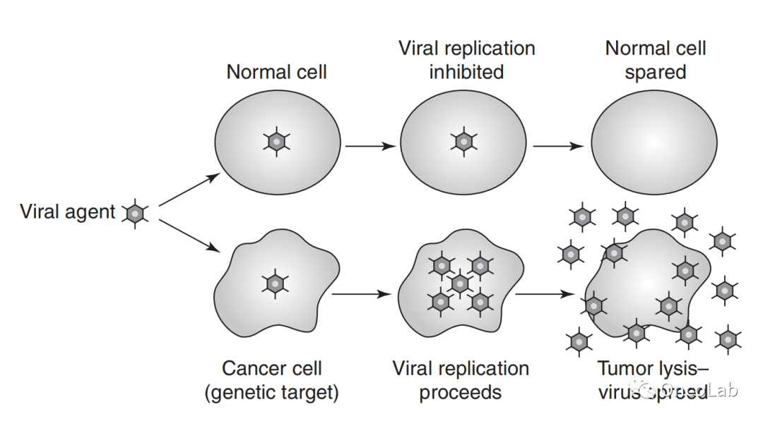 溶瘤病毒有两种类型:(1)由于依赖致癌信号通路或对先天性抗病毒信号敏感性提高,优先在癌细胞中复制,而非致病细胞不受影响;(2)经过基因操作和/或基因工程改造,插入或缺失在正常细胞而非癌细胞中复制所需的基因的病毒。