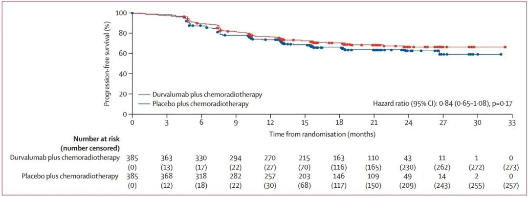 在2019年2月15日至2020年12月10日期间,共770名女性被随机分配(385名接受Durvalumab,385名接受安慰剂;中位年龄为49岁[四分位数间距41-57])。Durvalumab组患者的中位随访时间为18.5个月(四分位数间距13.2-21.5),安慰剂组为18.4个月(13.2-23.7)。在数据截止时,两组的中位无进展生存期均未达到(95% CI未达到-未达到),12个月无进展生存率分别为76.0%(95% CI 71.3-80.0),而对于安慰剂组为69.1%(95% CI 64.2-73.6)。在Durvalumab组和安慰剂组中,最常见的3级或以上治疗相关不良事件分别为贫血(18%对14%)和中性粒细胞减少症(11%对9%)。Durvalumab组中,有两例与治疗相关的死亡事件(一例中性粒细胞减少症和一例肺炎),而安慰剂组没有报告与治疗相关的死亡事件。