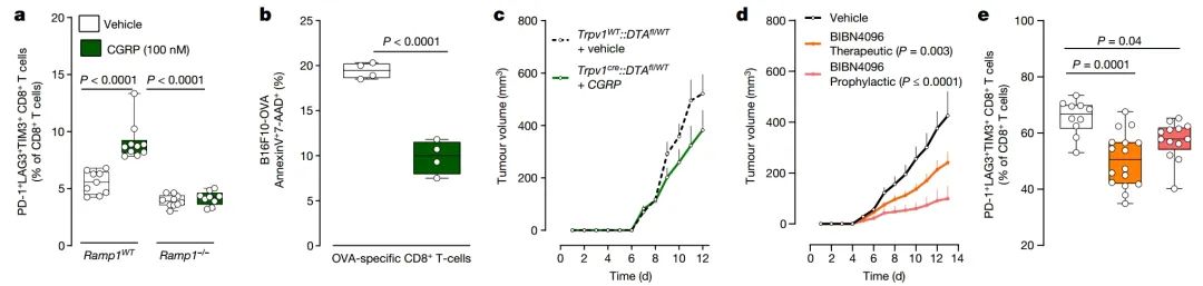 样本数量如下:a: Ramp1WT CD8 + 溶剂对照(n = 9),Ramp1WT CD8 + CGRP(n = 10),Ramp1−/− CD8 + 溶剂对照(n = 10),Ramp1−/− CD8 + CGRP(n = 9);b: 每组n = 4;c: 完整 + 溶剂对照(n = 15),消除 + CGRP(n = 11);d: 溶剂对照(n = 13),BIBN预防(n = 16),BIBN治疗(n = 18);e: 溶剂对照(n = 10),BIBN预防(n = 13),BIBN治疗(n = 16)。