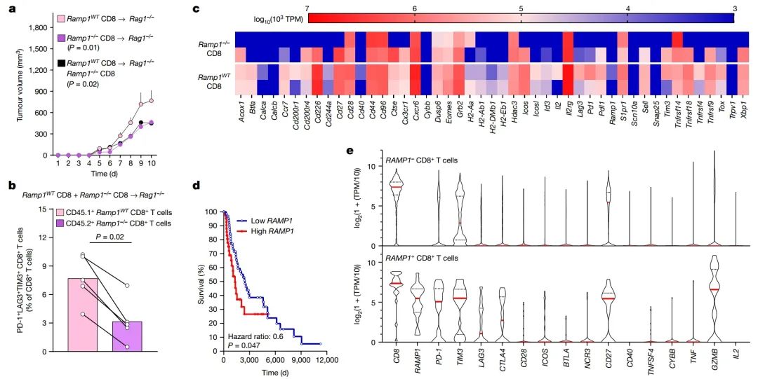 e, 人类黑色素瘤的单细胞RNA测序的体内分析揭示,与Ramp1阴性CD8+ T细胞相比,肿瘤内RAMP1表达的CD8+ T细胞强烈过表达数个免疫检查点受体(PD-1(也称为PDCD1)、TIM3、LAG3、CTLA4)。