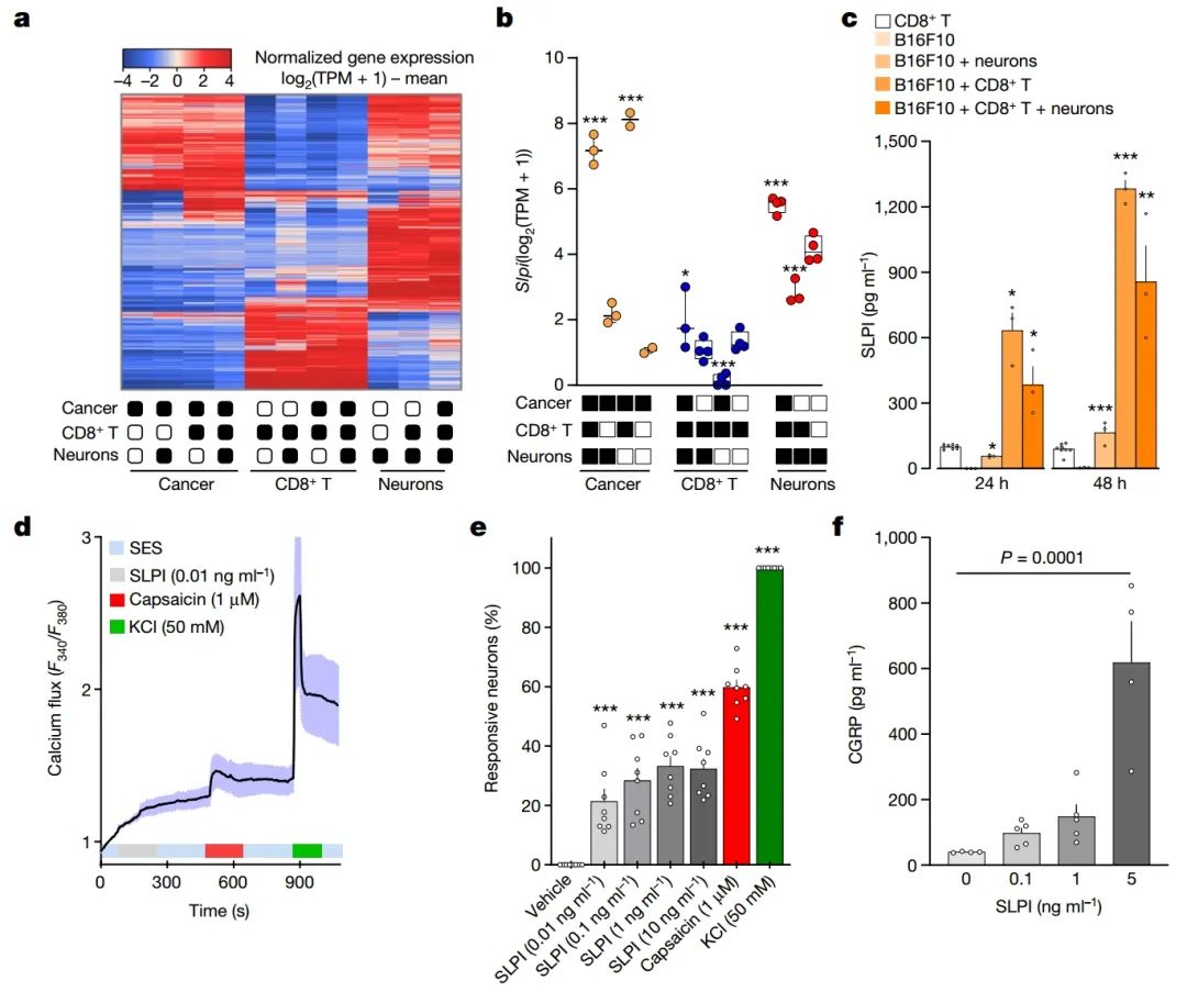 图 2 | 癌细胞分泌的SLPI驱动伤害感受器神经元释放CGRP