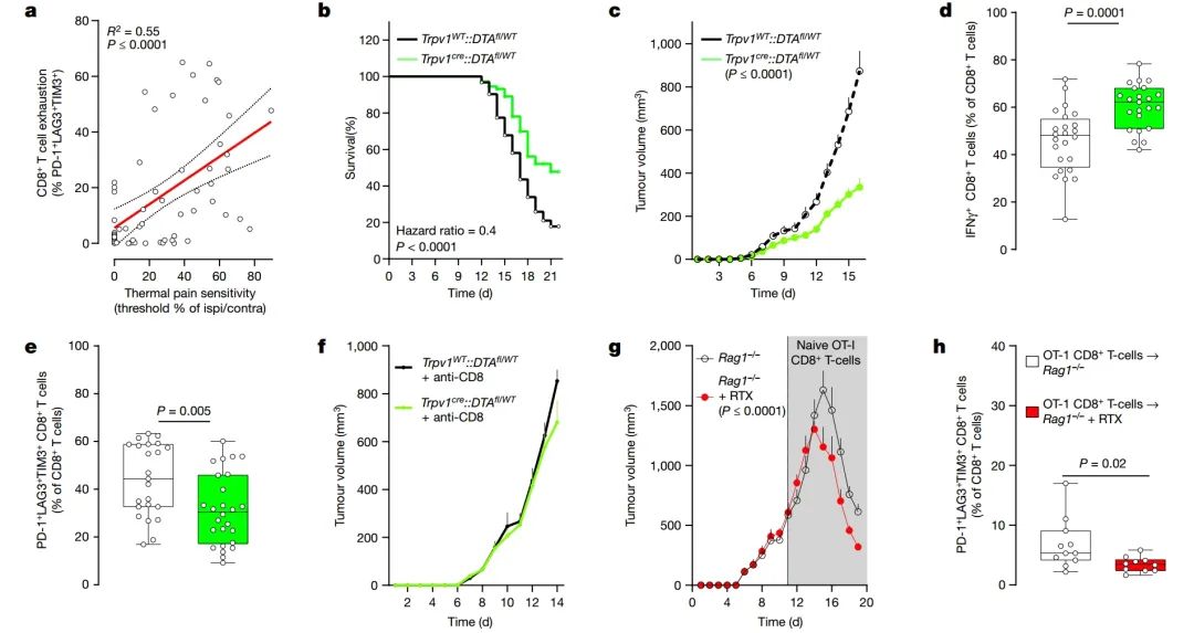 g,h, 为化学消除其伤害感受器神经元,Rag1−/−小鼠被注射RTX。28天后,小鼠被接种B16F10-mCherry-OVA(5 × 105个细胞,i.d.)。接受RTX注射且被动转移OVA特异性CD8+ T细胞(i.v.,1 × 106细胞,当肿瘤达到约500 mm3时)的小鼠显示出比暴露于载体的Rag1−/−小鼠更少的肿瘤生长(g;评估至第19天)和耗竭(h)。